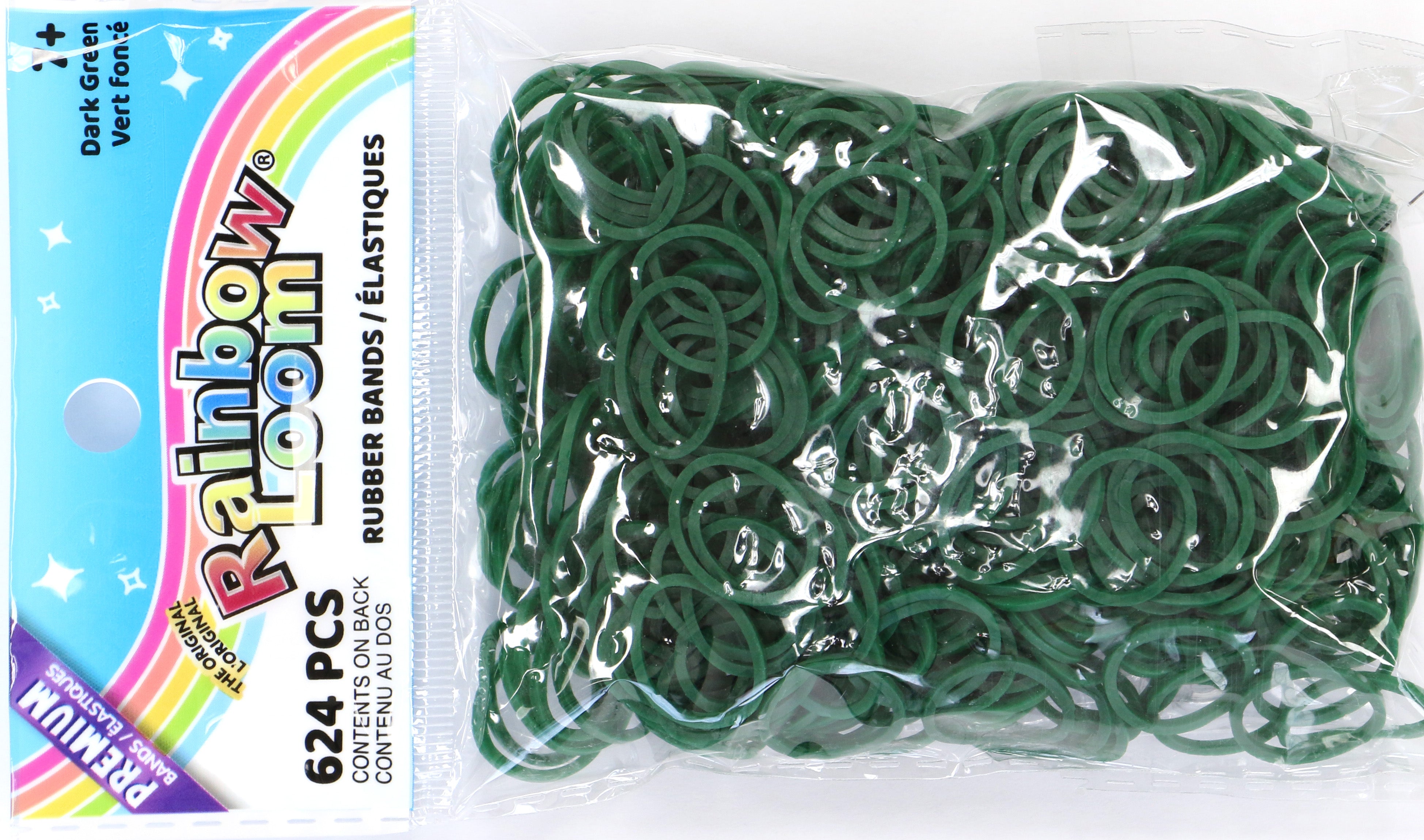 Opaque dark green color, 600+ non-latex*** rubber bands & a bag of 24 C-clips.