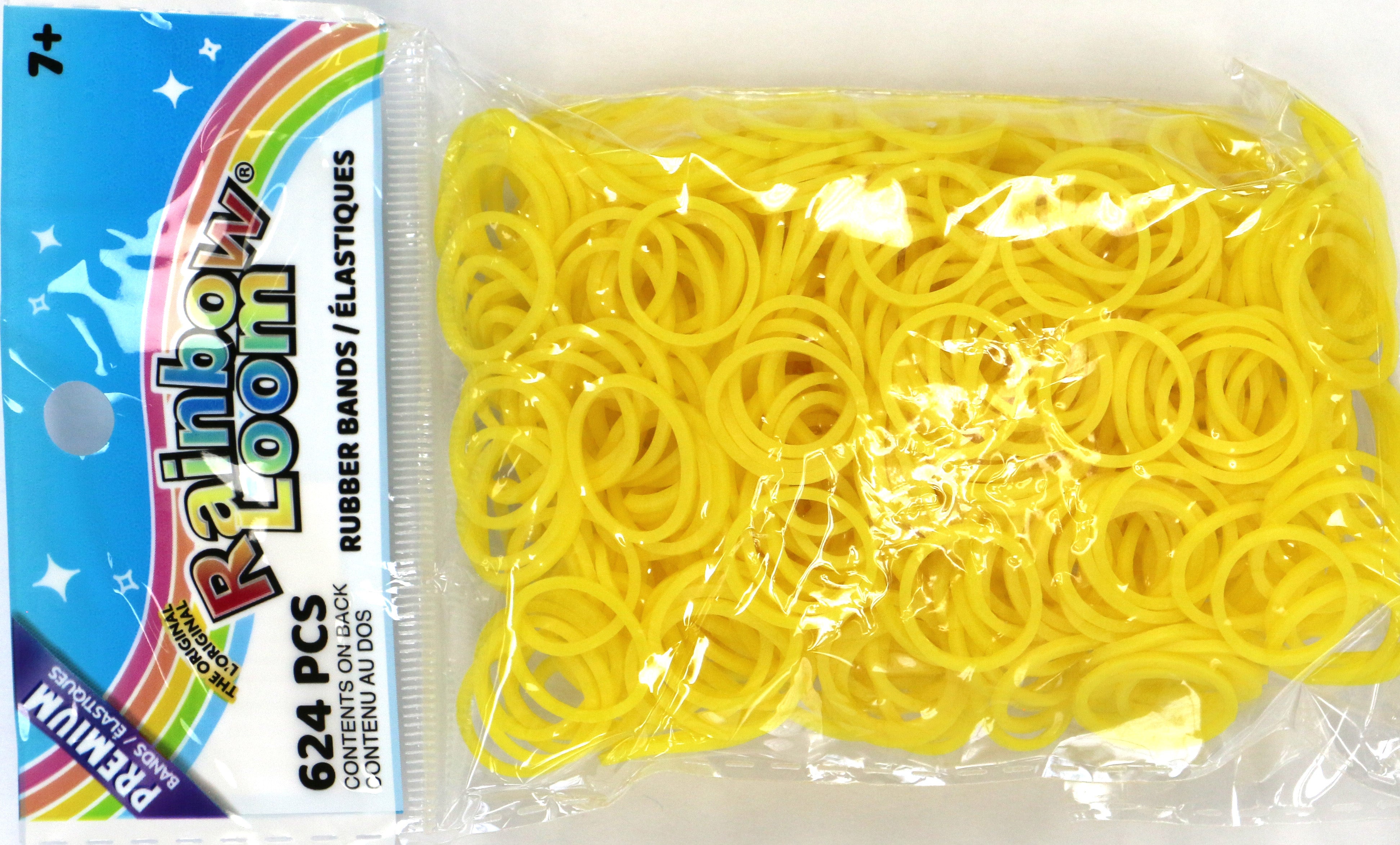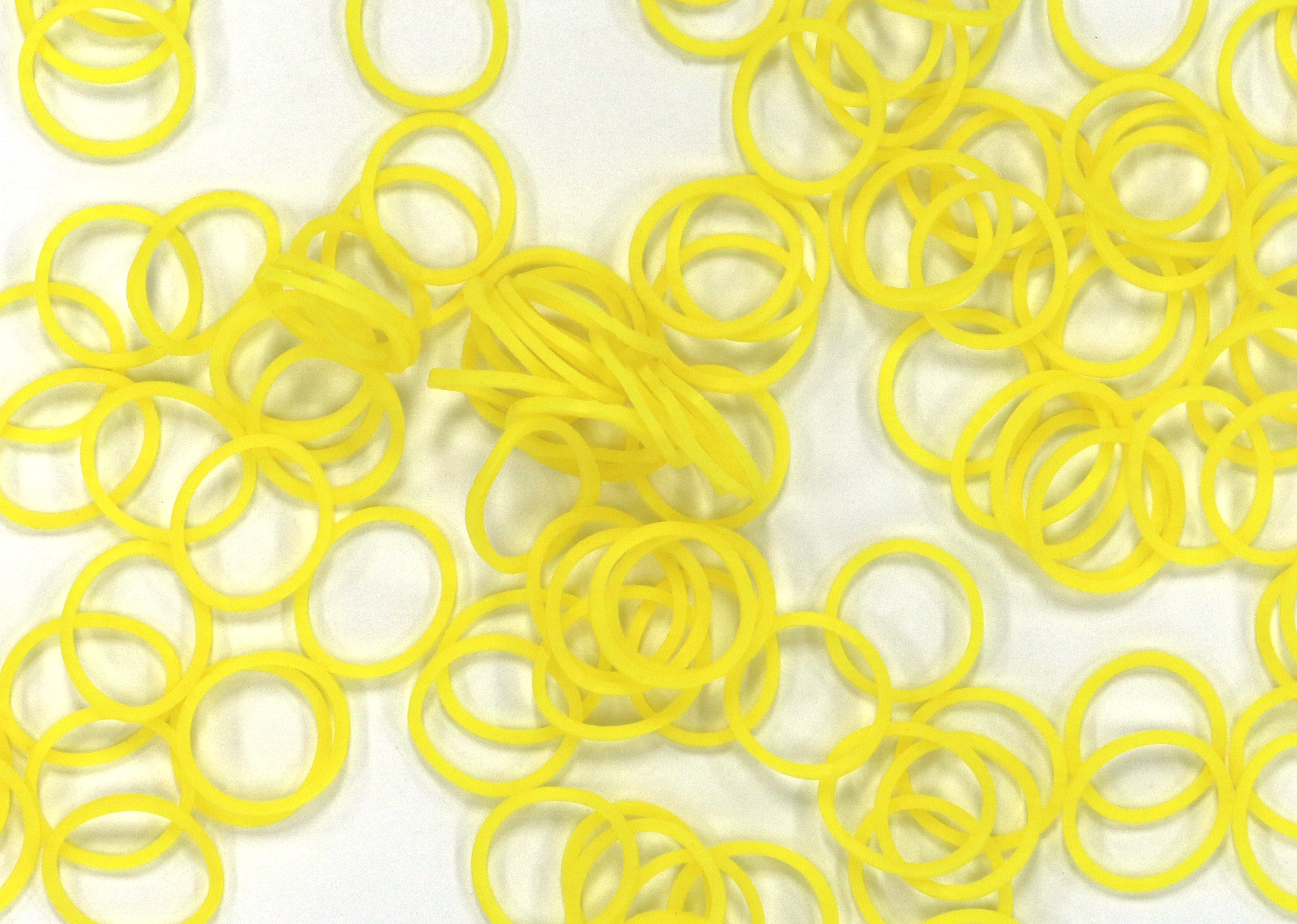 Opaque yellow color, 600+ non-latex*** rubber bands & a bag of 24 C-clips.